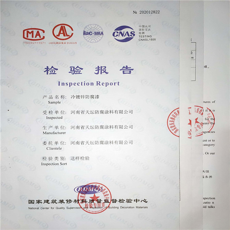 【注意事項】因鋅粉含量高,所以在調配時建議使用機械攪拌把甲組份攪拌均勻后,再加入乙組份攪拌均勻。漆膜表面易行成鋅鹽,故不宜長期暴露,在涂裝后道涂料之前,必須徹底清除表面的鋅鹽,否則影響漆膜的層間附著力。